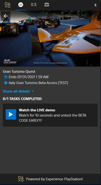 In diesem Bereich der Website gibt Sony PlayStation-Fans Quests um einzigartige Belohnungen zu verdienen. The dark corner of the site it has been discovered in is an Experience PlayStation promo. It depends if this was just a generic test of their systems and they chose Gran Turismo at random or its a test for a true Gran Turismo beta.