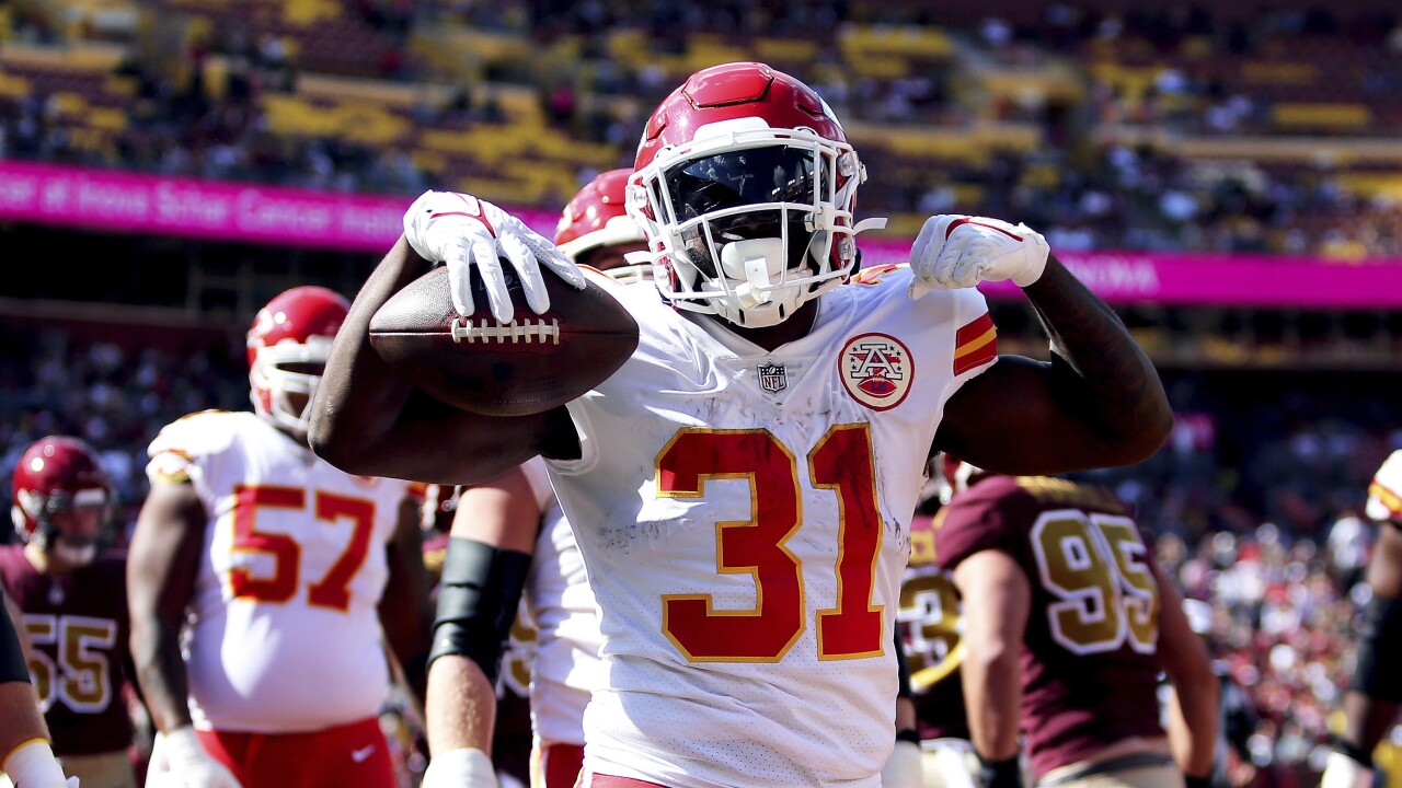 Kansas City Chiefs running back Darrel Williams 31 runs into the end zone during an NFL football game against the Washington Football Team Sunday October 17 2021 at FedExField. This was an important win as the Chiefs couldnt afford to fall too far behind. However the Chiefs are just too much for Washington on Sunday.